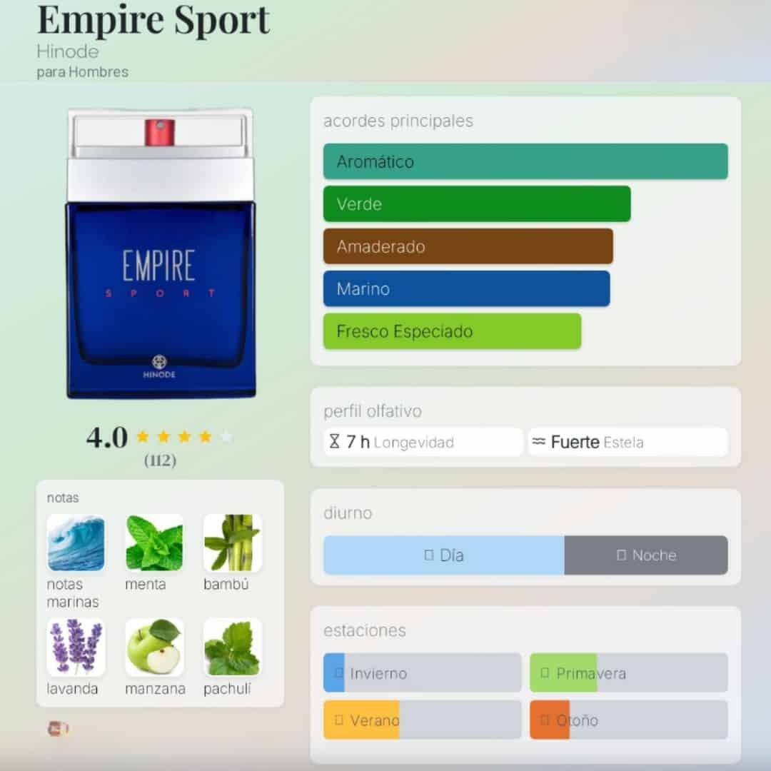 Empire Sport de Hinode pertenece a la familia Aromática Vibrante y captura la esencia del dinamismo moderno.